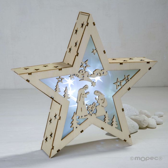 Decoracion Estrella Pesebre De Madera Con Luz Led 26x26cm