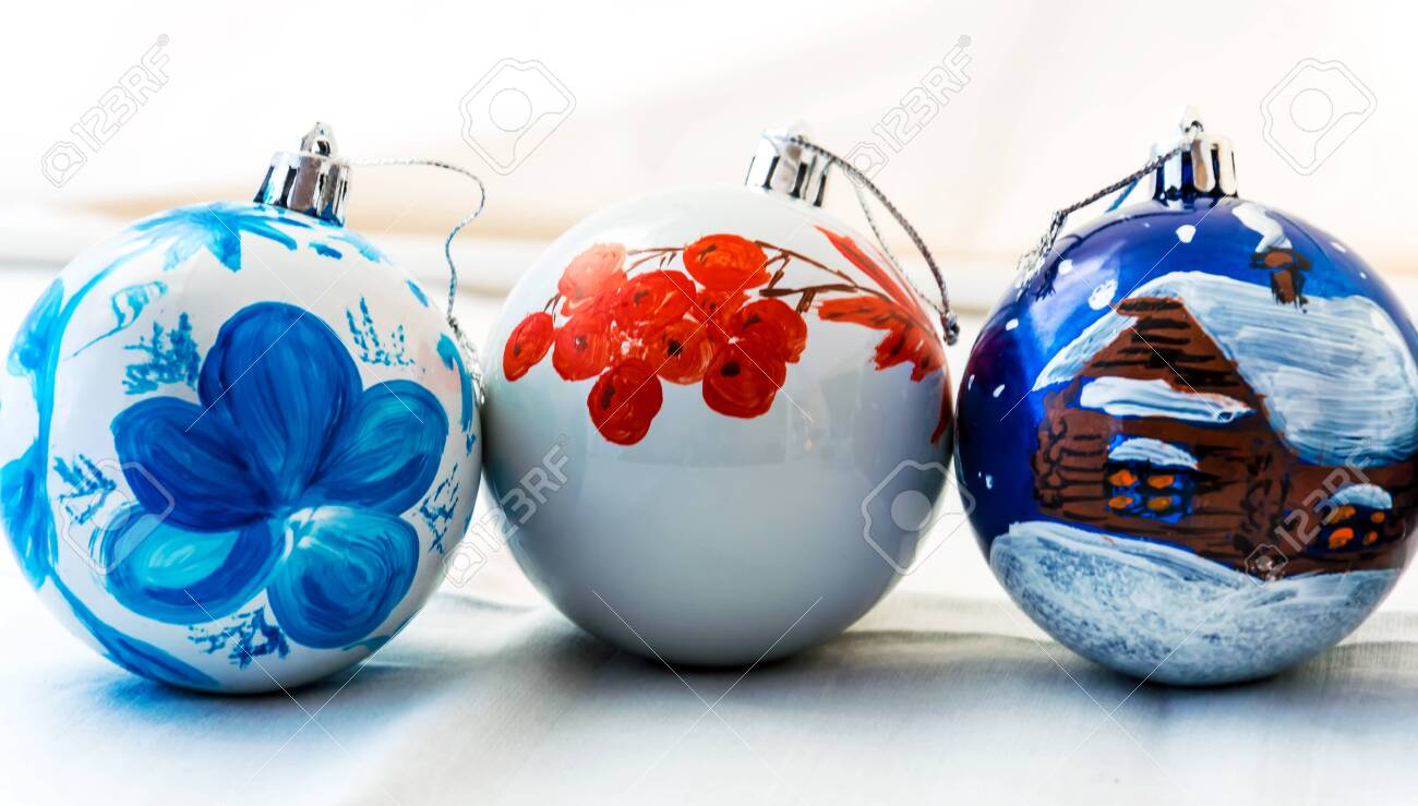 Three Handmade Christmas Balls On White Background Beautiful